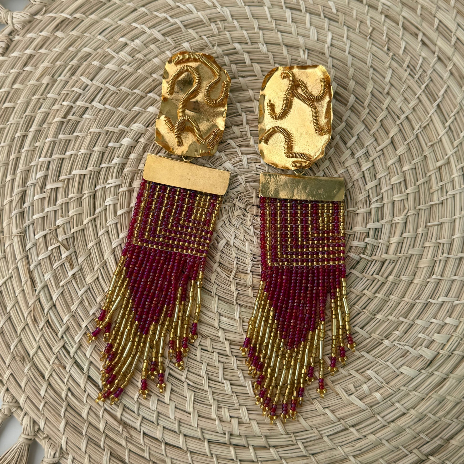Materials: Hammered bronze with gold finish + glass beads.