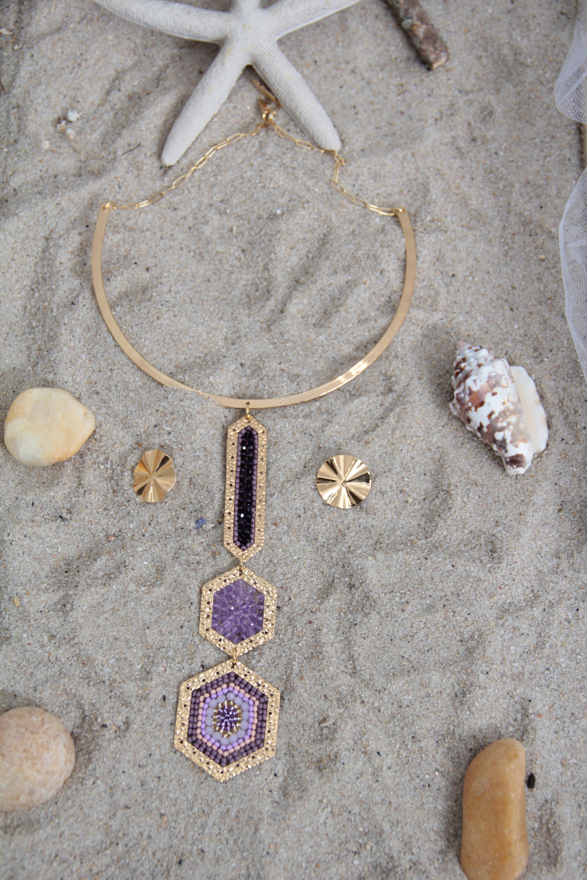 Materials: Gold metal base with hand-woven beads in a geometric design.