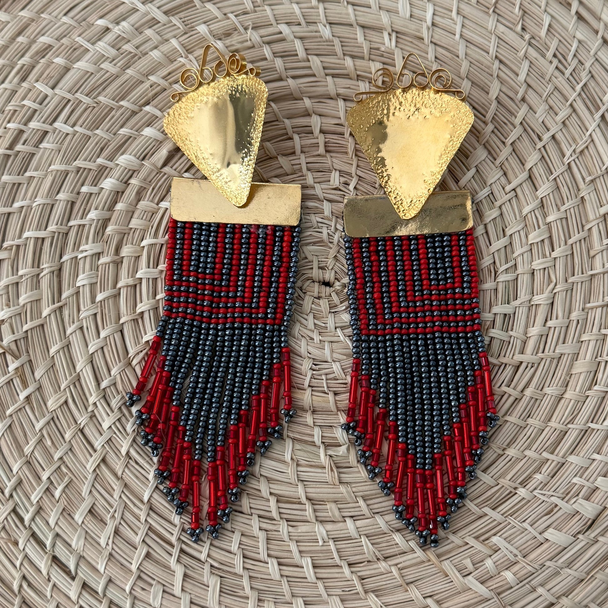 Design: Earrings with a triangular shape at the top and geometric pattern with fringe effect.