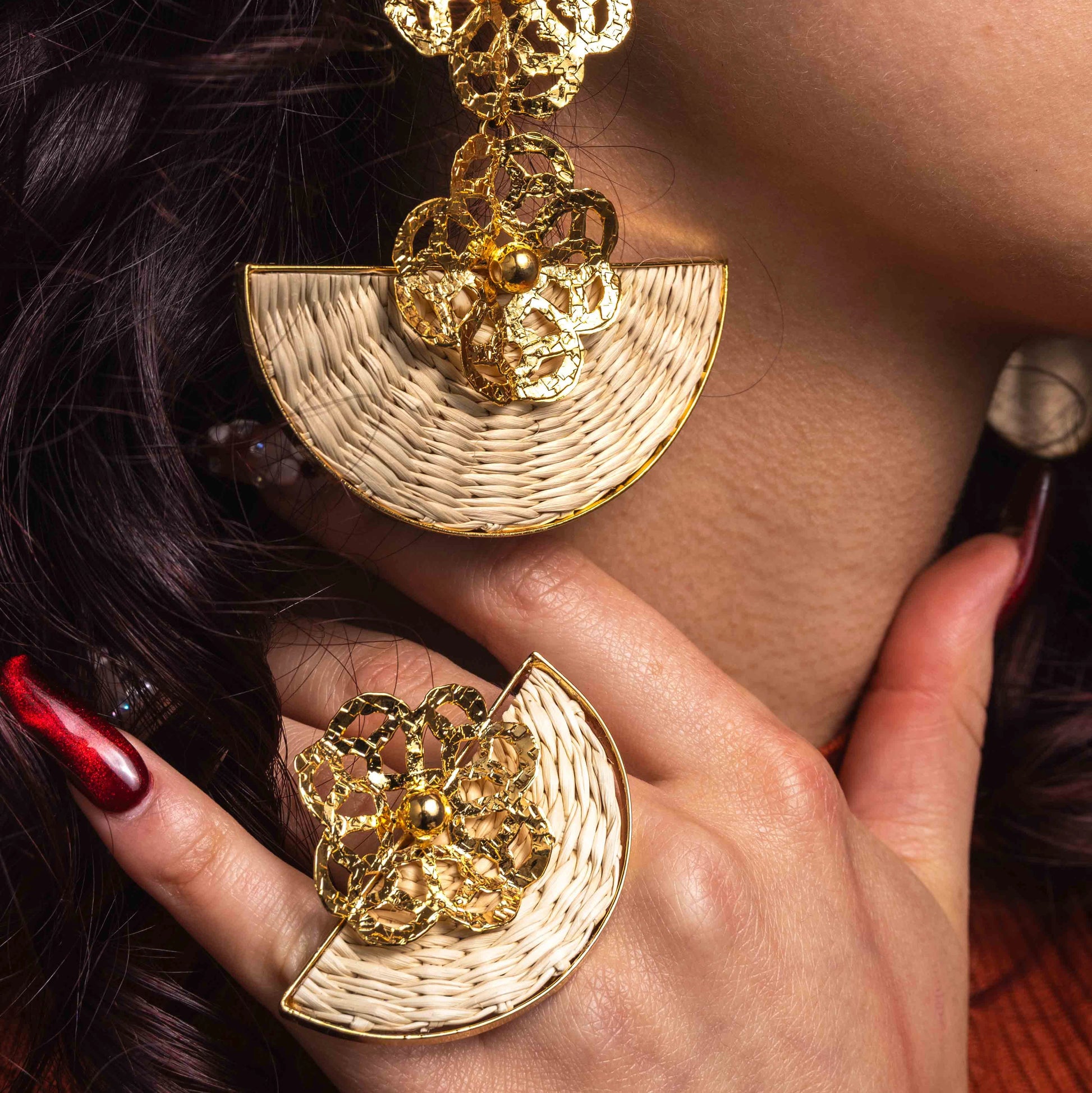 Set composed of earrings and a ring crafted from iraca palm, a traditional natural fiber from Colombia, carefully handwoven by skilled artisans.
