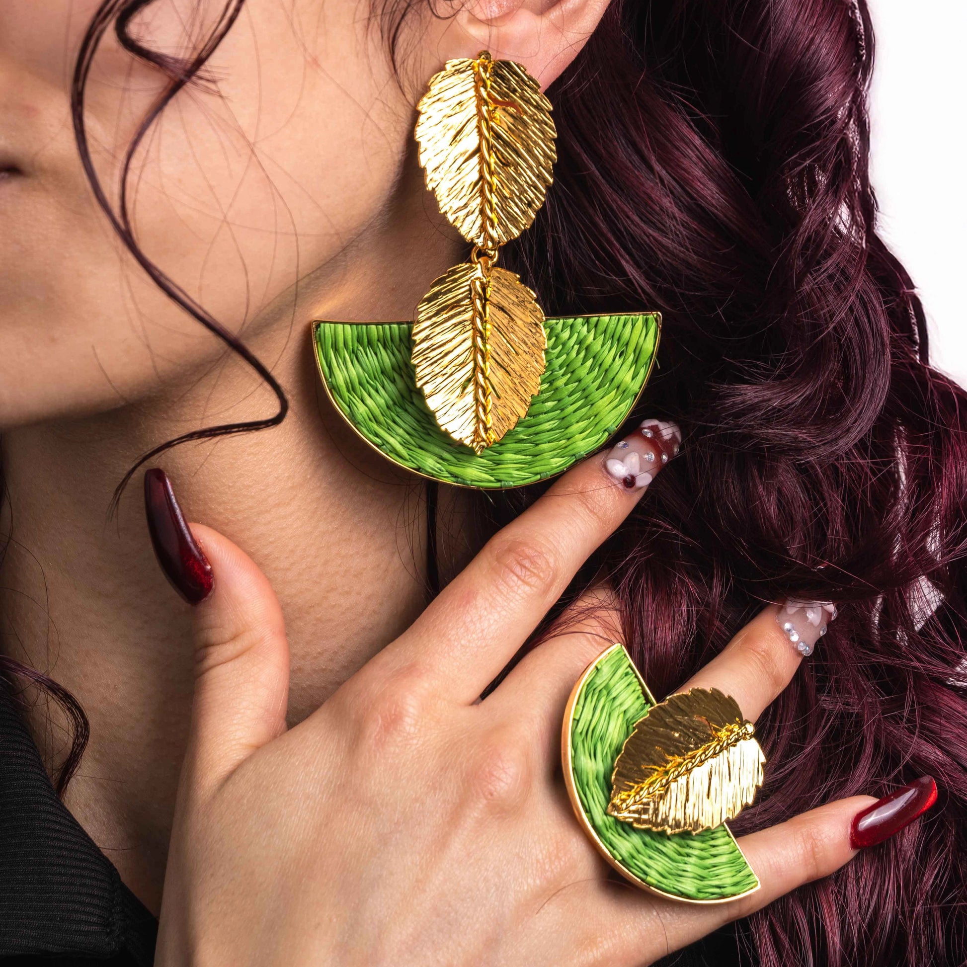 Set composed of earrings and a ring crafted from iraca palm, a traditional natural fiber from Colombia, carefully handwoven by skilled artisans.