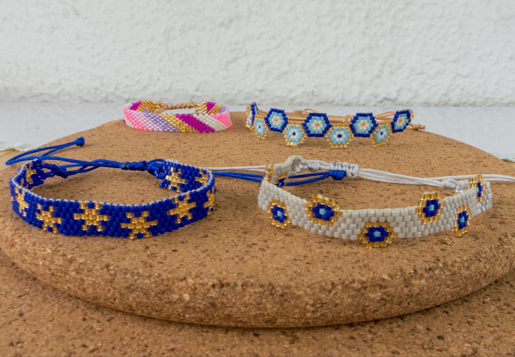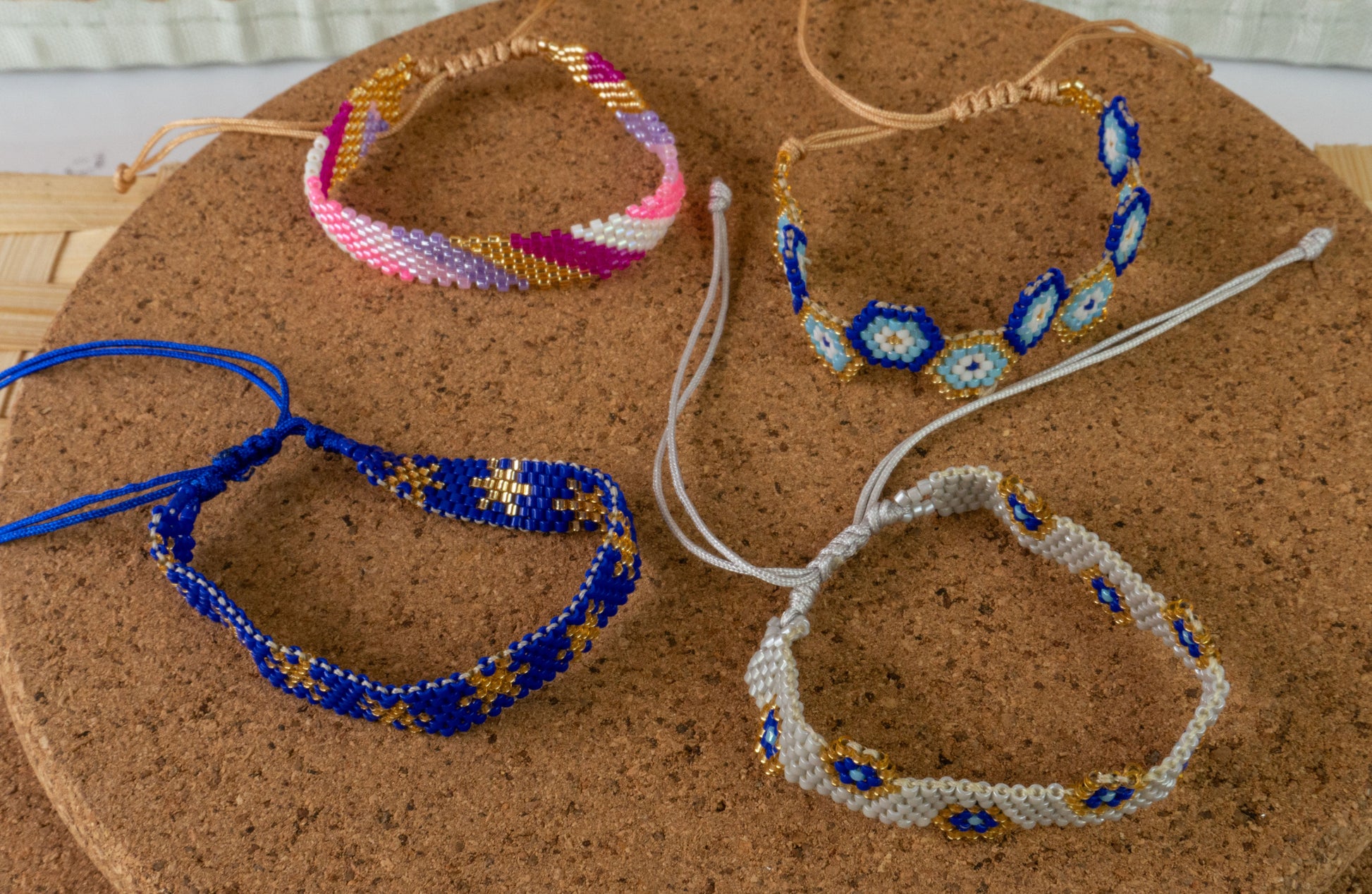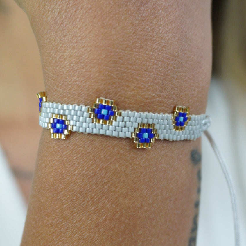 Materials: Hand-woven glass beads with waxed or nylon thread, with adjustable closure.